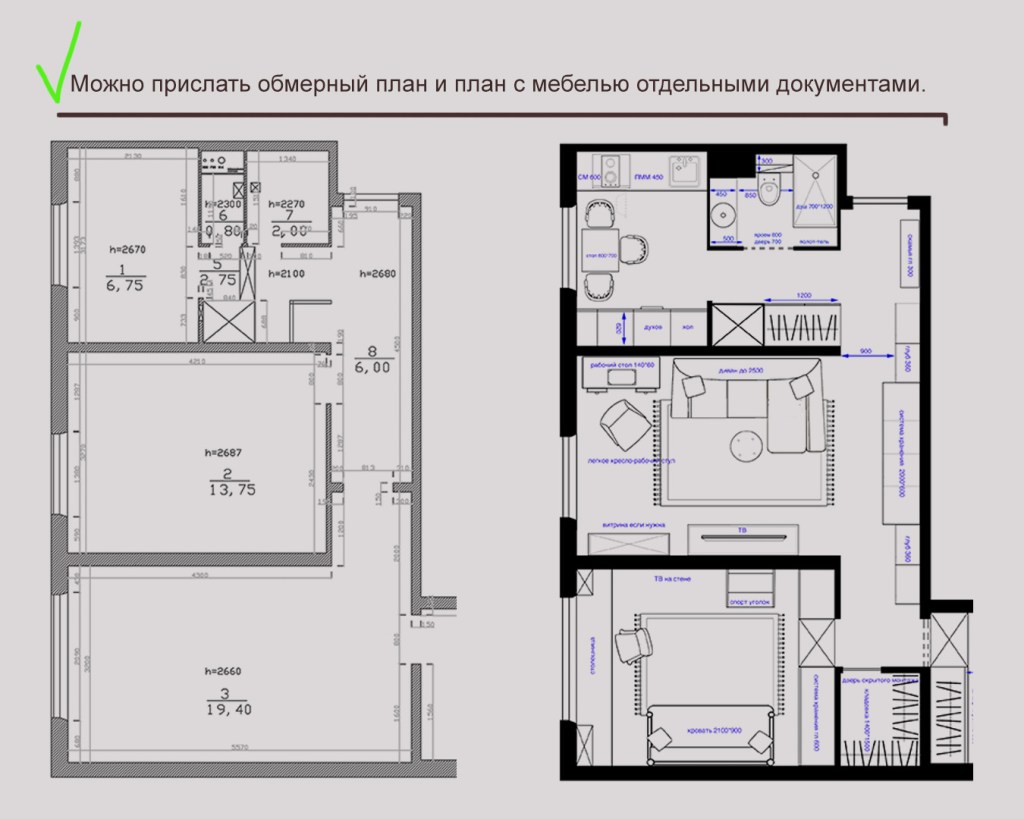 - Вся мебель, оборудование с размерами или ее размеры отдельно указать в письме.